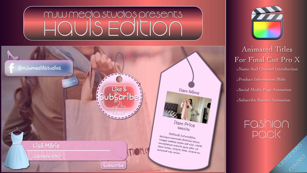 I have created these packs for anybody looking to create YouTube videos based on clothing and accessories. This pack features 4 custom animated banners showcasing the youtubers name, channel & social media tags. You will also find an animated product information banner; which you can fully customise with the product details you are showing during your video. The product banner also gives you an option to add an image or video showing the product as you continue to talk about the item.